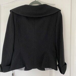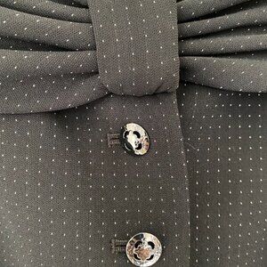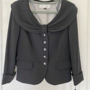 Beautiful black and white two-piece suit, new with tags. Jacket shell is 99% polyester, 1% rayon; body lining is 50% acetate, 50% nylon; sleeve lining is 100% polyester. Shirt shell is 99% polyester, 1% rayon; lining is 100% polyester.