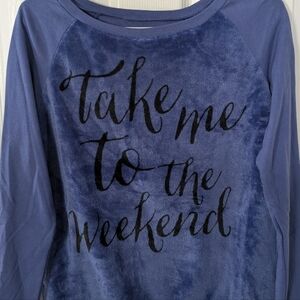 NWT, New, New With Tags, Blue, Indigo, Loungewear, Lounge, Athleisure, Sweater, Crewneck, Novelty, Take Me To The Weekend, Cozy, Comfy, Long Sleeve, Velour, Velvet, Pullover, Gold Rush, JCP, Polyester, Cotton, Hybrid Tees, Size Medium, Size M