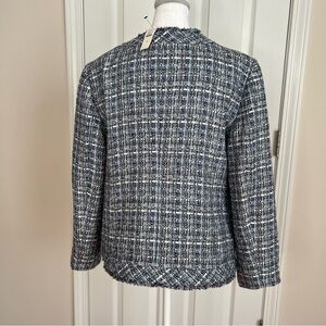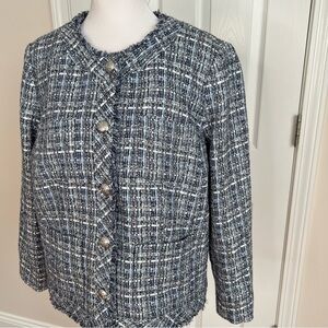 Talbots AMERICANA TWEED Blazer. Size 8. Blue/Gray. Made from elegant tweed with bold button and playful fringe . Front pockets. Full Lined. New with a tag. Have matching skirt size 6. Smoke free home.