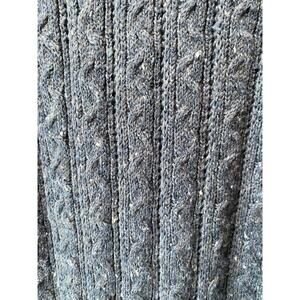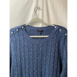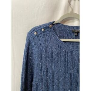 Talbots cable knit sweater dress with Silver buttons at the shoulders. The dress is in a beautiful cornflower blue sweater with white and light blue flecks.