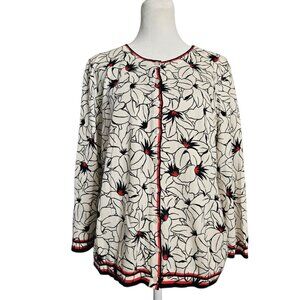 TALBOTS Charming Cardigan Women's Size Petite Large PL. Color is Cream/Black/Red. Floral print, Button front, lightweight sweater, 3/4 sleeve.
