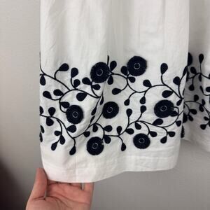 White cotton, embroidered floral hem in black, side zip closure, lined, a-line silhouette, size 2P.