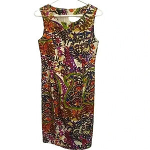 Beautiful and classic sheath dress. Vibrant colors with floral and paisley print. Sleeveless and lined. Hidden back zipper closure.