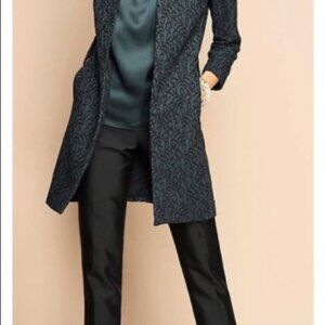 Brand new with tags! Gorgeous Talbots open-front topper jacket in an elegant green and black lace design. Fully lined with a flattering straight silhouette and long sleeves — perfect for layering over dresses, blouses, or evening outfits. The textured lace pattern adds a refined touch, making it ideal for fall and winter events.