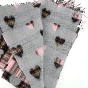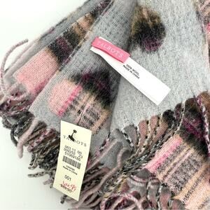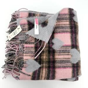 NWT Talbots Plaid 100% Wool Fringe Scarf Reversible Pink Gray 73"x18"