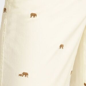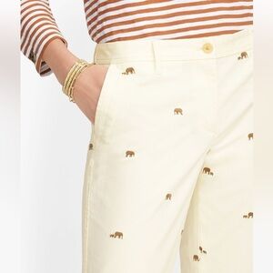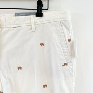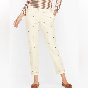 Talbots Relaxed Chino Embroidered Elephants in Ivory. Features button zip closure, front slant pockets, rear slit pockets, relaxed fit, ankle length. Some stretch. Color is a creamy ivory (pictures are lighter to show detail).