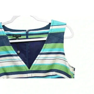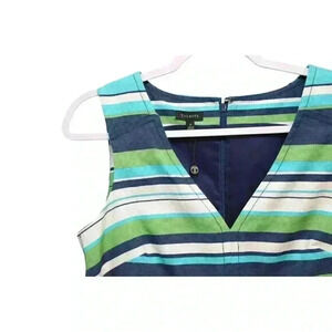 Add a pop of color to your wardrobe with this beautiful Talbots Sheath Midi Dress. The dress features a flattering V-neckline and sleeveless design, making it perfect for any occasion. The multicolor striped pattern adds a touch of preppy style, while the stretchy spandex and cotton material ensure a comfortable fit. The dress also includes several features such as a zip closure, pockets, and lining, making it both stylish and functional. Ideal for travel, wedding, party/cocktail, casual, workwear, or business, this dress is a versatile addition to any wardrobe.