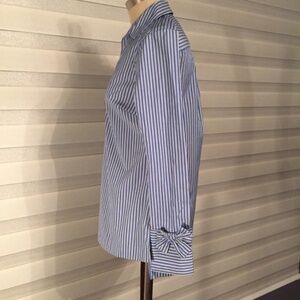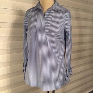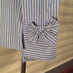 Talbots Long sleeve v-cut Striped Shirt with a bow at the wrist of each sleeve and high low cut.