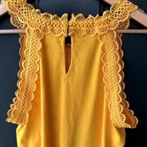 100% cotton knit halter tank in a gorgeous sunflower yellow by Talbots, perfect for spring and summer! Neckline and sleeves are trimmed in a beautiful embroidered lace--imagine this tank with navy nautical themed pants this summer. Stunning!