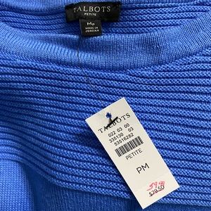 NWT Talbots Sweater. Size Medium PETITE. Gorgeous blue color and adorable button shoulder detail. Smoke-free, pet-friendly home. Bundle items to save on shipping!
