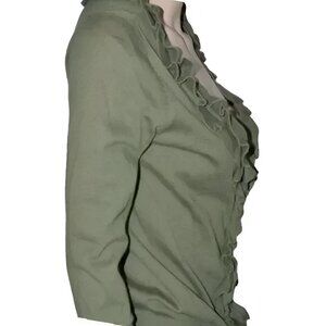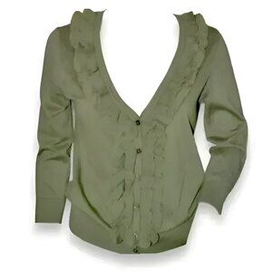Offered is this lovely 3-season lightweight sweater by Talbots for the Black Label line, a discontinued model. The cardy is olive green of lightweight and soft Pima cotton. The sweater is a button-down front cardigan embellished with ruffles. The sweater is in excellent condition and retains the original store tag.