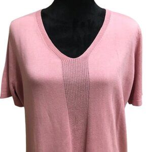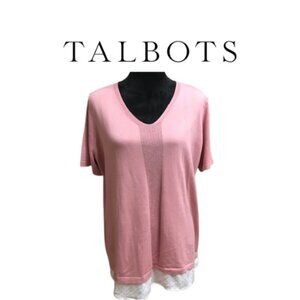NWT Talbots Women's Plus Size Layered Look Pink Top With polka dot mock shirt trim. V-Neck; short sleeves. Pullover style with Attached Pink & White Polka Dot Mock Shirt at the Bottom of sweater. Color: Dusty Rose Pink