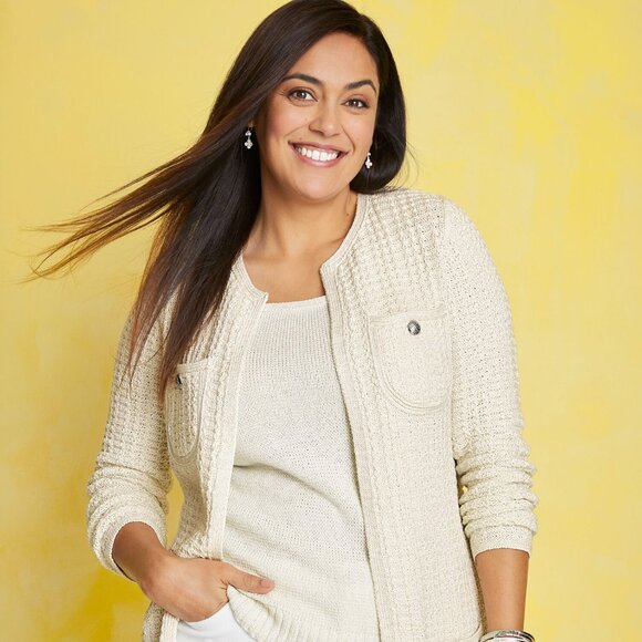 Item: Talbots Textured Metallic Knit Cardigan Coat Women’s M, NWT, Chic Neutral Layer, Lightweight Polished Sweater Jacket