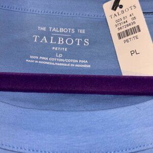 Talbots light blue elbow sleeve round scoop neck top shirt in a woman's size LP. The bust is about 40 inches, length is about 24 inches. The material is 100% cotton. The shirt is new with tags from my smoke free home.
