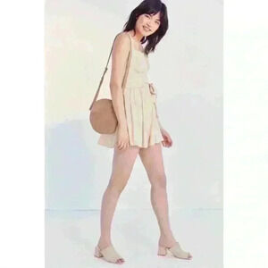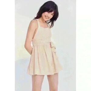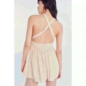 Tan romper with an open cross crossed back. Bow in the front or back. Zipper closure in the back. Adjustable straps. 100% Rayon Size 6