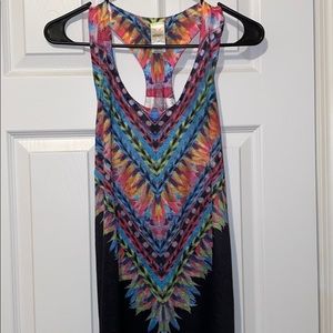 NWT Very cute shirt Dark gray with multi color design on neck front and back Very soft Loose fit 95% Poly 5% Spandex