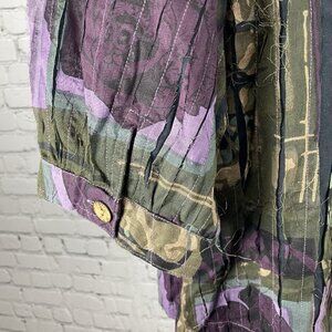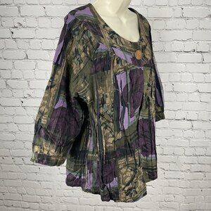 NWT Tantrums Green & Purple Rose Pleated Wood Buttoned 3/4 Sleeve Blouse Size 1X