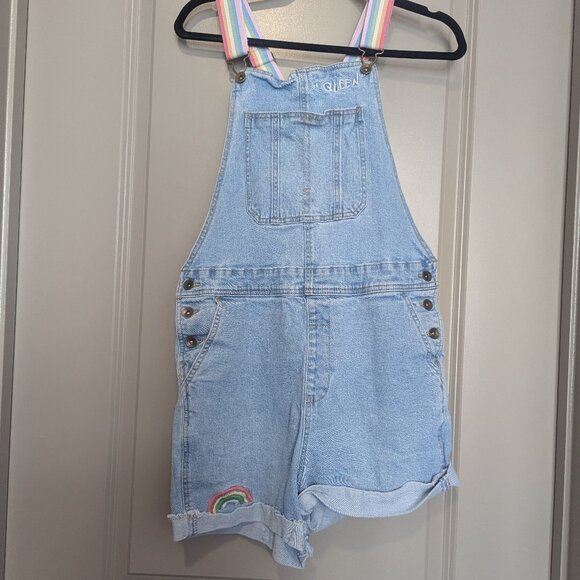 Keep your Pride style high wearing the Pride Adult Rainbow Shortalls. These denim shortalls feature the embroidered text "Queen," along with