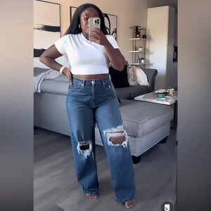 FEATURES: super high rise/high waist; baggy fit; mostly rigid denim with a hint of stretch; 5 pocket; belt loops; distressed/ripped; as seen on TikTok!