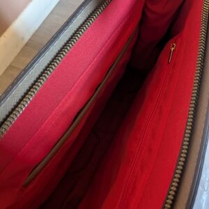 Features include: Faux leather, zipper closures, interior pockets, a red and black stripe.
