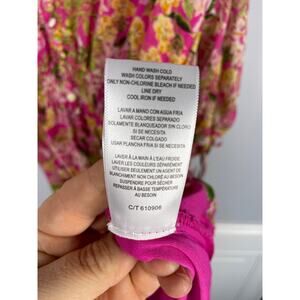 Item Description: Bright pink boho dress with floral print, sheer sleeves, and ruffle hem.