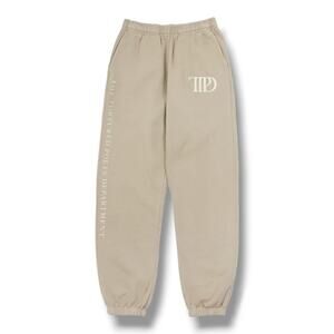 "Parchment beige sweatpants featuring "TTPD" album logo printed on wearer's left leg and "The Tortured Poets Department" printed down wearer's right leg. Drawstring waist and side pockets.