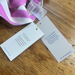 Description: Adorable little baby hat for the sun, swimming, beach or just outdoor play. Reversible patterns with ice cream cones with rainbows on one side and purple and white stripes on the other. Built in UPF 40. Elastic around the outside.