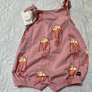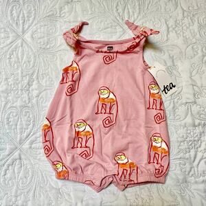 New with tags Tea Collection Tie Shoulder Baby Romper. One piece sleeveless outfit in Cochin monkey print in pink. Size 3-6 months.
