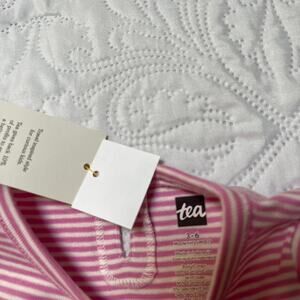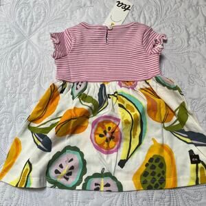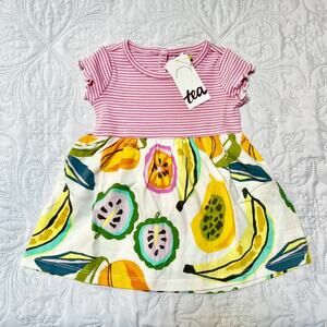 New with tags Tea Collection Baby Print Mix Empire Dress in Tropical Fruit. Short sleeve mixed print dress with pink striped top from Caribbean collection. Size 3-6 months.