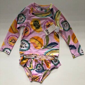 This scrumptious rashguard swim set features a feast of tropical fruit on a shell-pink background. Super stylin' details include long raglan sleeves and a dropped-waist ruffle bottom.