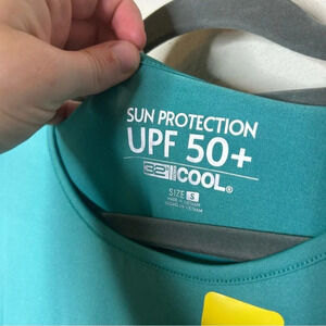 New with tags. Never worn. Teal green in color. Provides spf 50 protection to the skin. Has a zipper pocket.
