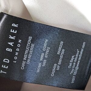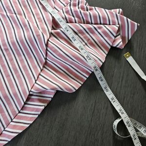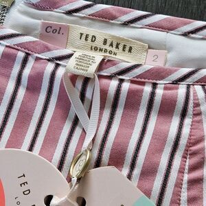 The NWT Ted Baker Coryn Layered Striped Ruffle Midi Skirt in pink is a stylish and versatile piece perfect for various occasions such as travel, casual outings, and workwear. Made from a blend of polyester and viscose, this A-line skirt features a ruffle accent and a midi length, making it ideal for the spring, summer, and fall seasons. The skirt is lined for added comfort and has a zip closure for easy wear. With its designer brand and preppy theme, this Ted Baker skirt is a chic addition to any woman's wardrobe. See pictures for measurements