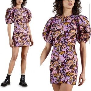 A modern mini with vintage 60's influences, puff sleeve with a sublime silhouette and a bright intricate paisley print.