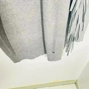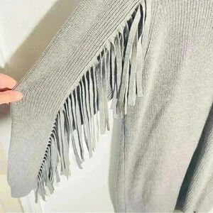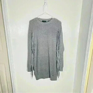 Description: Crew neck. Long sleeves with fringe detail. Midi length. Knit construction. Slightly more fitted at hem.