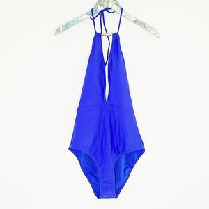 New with Tags Ted Baker London Pikaa halter one piece swimsuit in Bright Blue. A classic halter swimsuit with a deep front cutout and open back. Ties at back of neck. Moderate coverage. Lined.