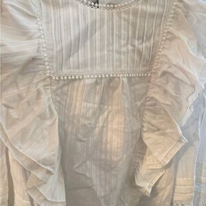 This elegant white blouse features delicate ruffles for a sophisticated look. Perfect for any occasion.