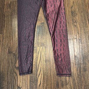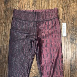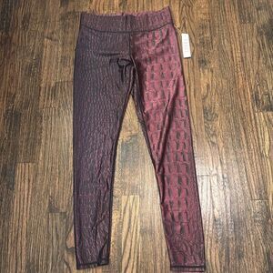 Terez Printed Tall Band Legging (350-02). These sleek, sporty leggings have an allover patterned print and a soft, breathable stretch body for ease of wear. Made of polyester and spandex knit. Tall, covered elastic waistband provides a smooth, custom fit. Allover patterned body. Flat-lock stitching helps prevent chafing and contours the body. Sweat wicking performance keeps you cool and dry. Fitted styling. Self-lined, triangular crotch gusset for comfort and fit. 87% Polyester, 17% Spandex.