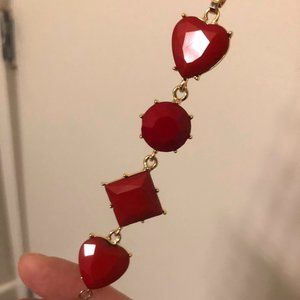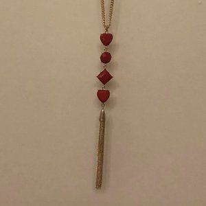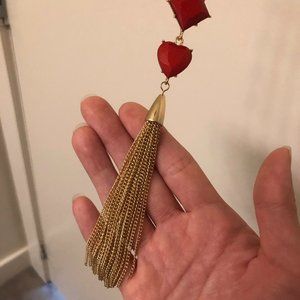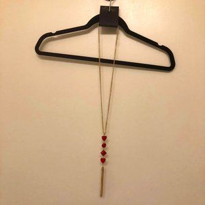 Brand new with tags! Long, sparkling gold necklace with a pendant composed of shiny red gemstones and a gold tassel.