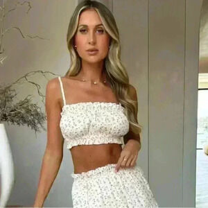 Summer vibes in the Selina Set! This gorg crop offers a frilly neckline with an elasticated band for lots of stretch, double lined material and thin adjustable straps. Style her with the matching skirt and a pair of White Sandals.