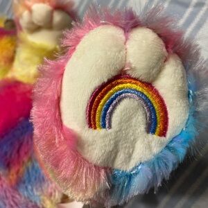 NWT The Bear Factory tie-dye colored bear. Rainbow foot design. Faux fur filled with 100% polyester. Velcro pocket on back. Recommended for ages 3 and up. Approximately 17” x 14.” New with tags; never used!