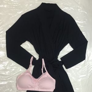 My bamboo robe was designed for the sensitive woman who enjoys comfort, easy packing and fashion whether home or on the go. My robe is made from 95% Bamboo and 5% Jersey. It was manufactured in Los Angeles, CA, so American Made!Shawl collar, removable tie, slit pockets and falls just below the knee. Bamboo is thermo regulating so this robe will keep you cool when you're hot or warm when you're not. Perfect for going through menopause. The feeling of silk, this will be your go to robe.