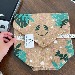 NWT The Body Shop Palm Tree and Polka Dot Print Natural Jute Pouch. Created by fair trade Teddy Exports to create living wages. Super cute boho fun palm tree print with polka dot. Button for closure. Can add perfume, body lotion, shampoo and conditioner inside for a nice thoughtful cute gift.