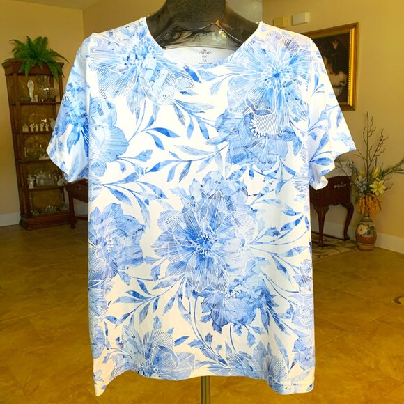 This is a NWT 'The Classic Tee' women's basic T-shirt in size 1X. It is new, never worn still with the tags attached. The price has been cut off, so I don't know the original retail value. Fabrication is 100% medium weight cotton. It features a pretty blue floral design on a white background. It has a round neckline and short sleeves. It measures 25 inches around under the arm and 28 inches from the shoulder to the hem. Machine wash cold and tumble dry low. This is the perfect tee for Spring or Summer and would look great with shorts or capris. It would be a great addition to anyone's wardrobe.
