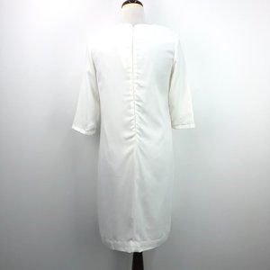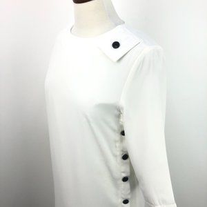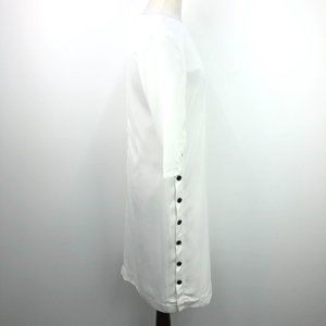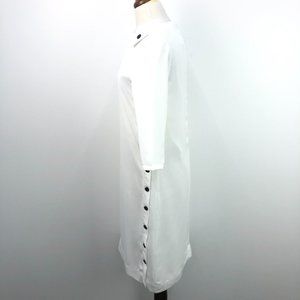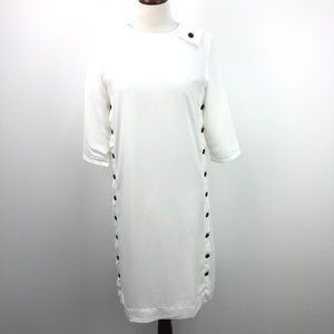 New with tag The Collective white button detail midi dress. Jewel neckline with tab with button detail on left shoulder. 3/4 sleeves with 9 button detail on each side of dress. Hidden back zipper. Damage: Stain on collar and back of dress. Fully lined. Not original owner. See pictures. Sold as is.