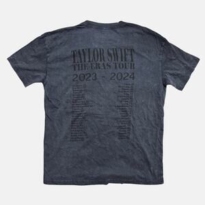 Mineral wash gray t-shirt featuring photos of Taylor Swift printed on front with "Taylor Swift | The Eras Tour 2023-2024" and U.S. and international tour locations printed on back.