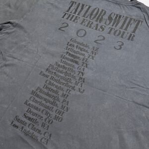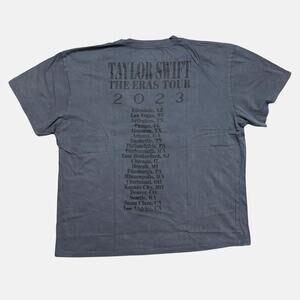 Mineral wash gray t-shirt featuring photos of Taylor Swift printed on front and "Taylor Swift | The Eras Tour" printed on wearer's left sleeve with "Taylor Swift | The Eras Tour", tour locations, and Taylor Swift album titles printed on back.