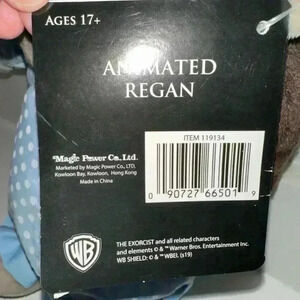 This is a new with tags and box "The Exorcist" Animated Regan plush toy. It is made by Magic Power Co. Ltd. and is approximately 12 inches tall. The plush is made of polyester fibers and has a blue and white polka dot dress. The toy has a brown wig and yellow eyes. The toy is in new condition and has never been played with. The toy is packaged in a clear plastic bag with a cardboard backing. The toy is suitable for ages 17+.