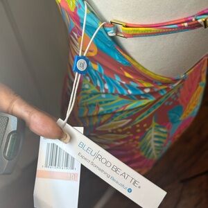 Turn heads poolside or at the beach in this stunning Bleu Rod Beattie one-piece swimsuit, brand new with tags. Featuring a bold tropical multicolor leaf print, keyhole front with gold ring detail, and a flattering crisscross back design. Stylish, vibrant, and high-quality — a perfect choice for vacation or summer lounging.