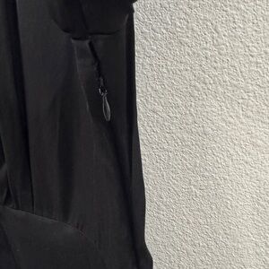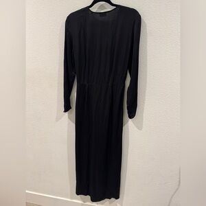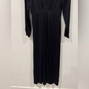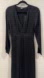 Black, long sleeves, v neckline with gathered detail at waist, unlined, maxi length, side zipper. Formal, neutral, minimalist, lbd, events, black tie, evening, cocktail