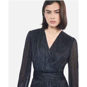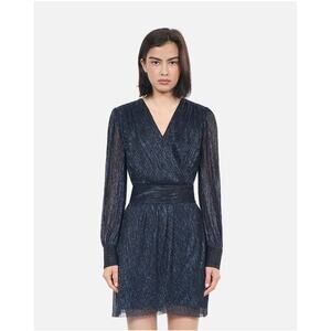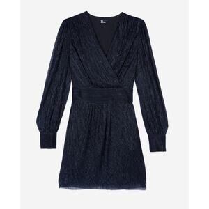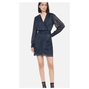 Stunning The Kooples navy blue metallic jersey dress, perfect for holidays and special occasions. Features sheer long sleeves, flattering wrap V-neckline, and a wide waistband for a cinched silhouette. Elegant, chic, and universally flattering.